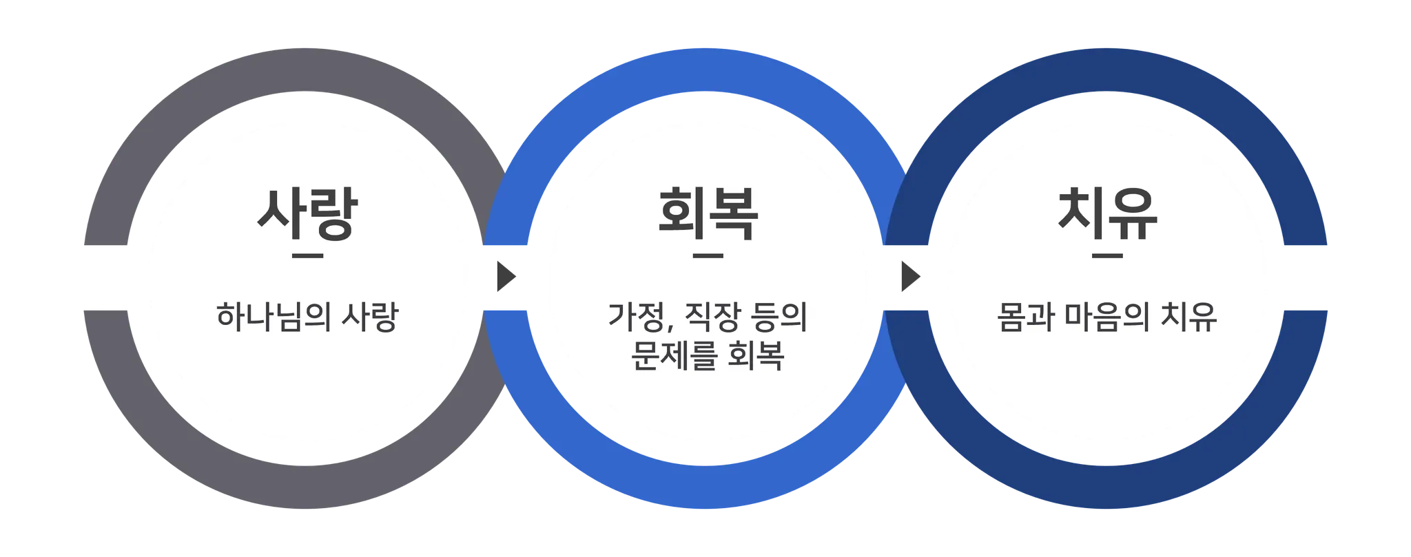 우리 교회는 하나님의 사랑으로 가정, 직장, 환경과 같은 문제로부터 회복하고, 심령의 치유를 얻는 것을 목표로 사역합니다.