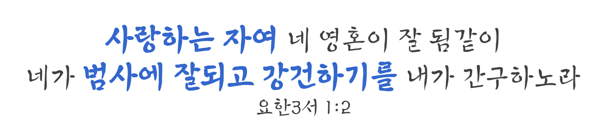 우리 교회는 요한3서 1장 2절의 말씀을 비전으로, 모든 성도님들이 주님 안에서 범사에 강건하기를 소망합니다.